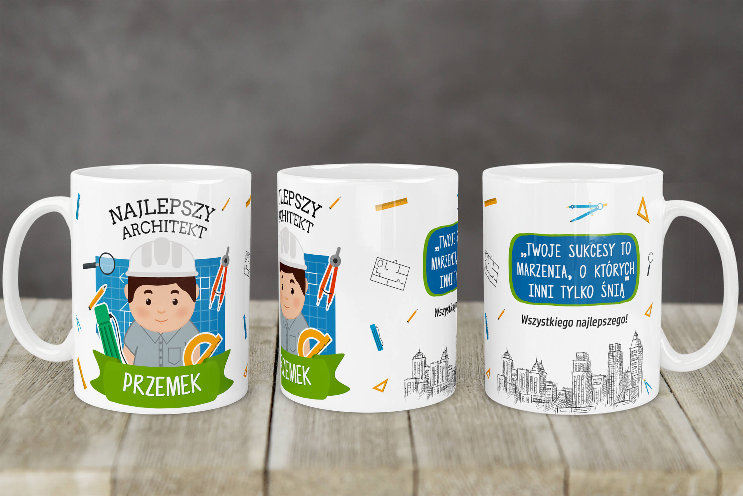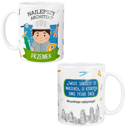 Z jednej strony kubka masz miejsce na podanie imienia Architekta, a na odwrotnej stronie znajduje się miejsce na spersonalizowany element.