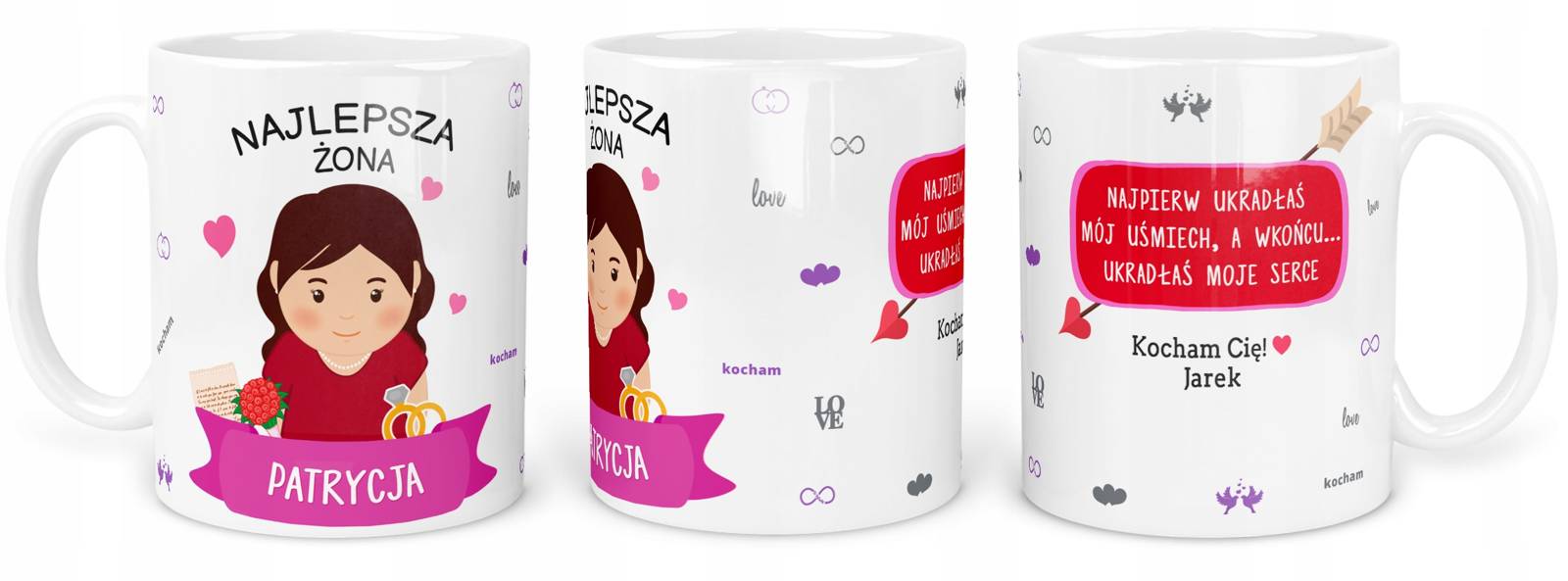 Kubek ten został stworzony z myślą o zrozumieniu głębokiej miłości, którą żywisz do swojej żony. Jego wzór nawiązuje do romantycznych elementów oraz symbolizuje piękno, które płynie z waszego wspólnego życia.