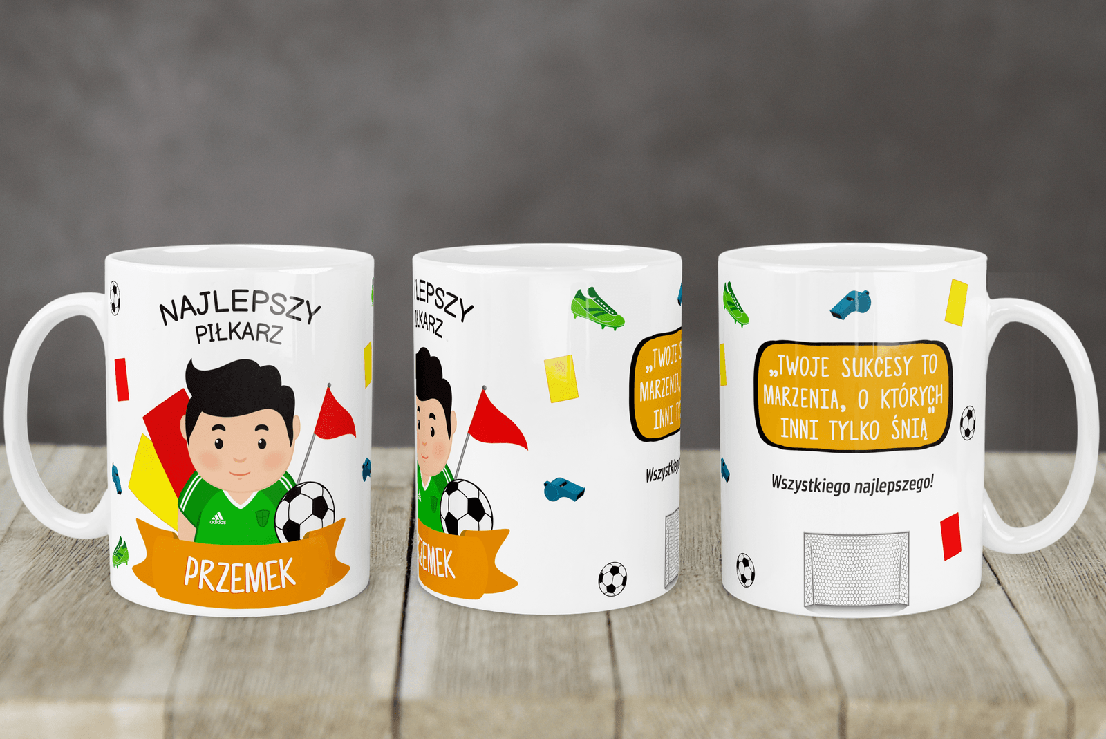 Na kubku znajduje się unikalny wzór z piłkarskimi motywami oraz miejsce na umieszczenie imienia lub nazwiska trenera lub piłkarza.