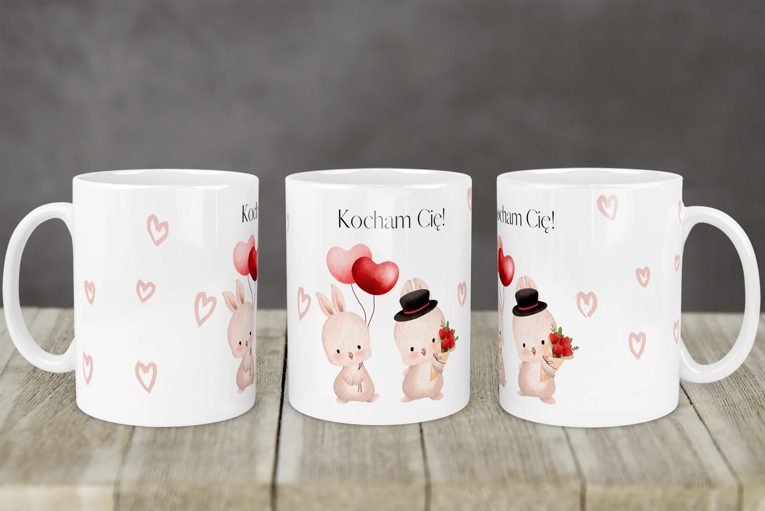 Kubek z napisem „Kocham Cię!” i uroczymi króliczkami to wyjątkowy sposób na okazanie miłości. Delikatny, romantyczny design z serduszkami, balonami i kwiatami sprawia, że to idealny prezent na Walentynki, rocznicę, urodziny lub bez okazji, by przypominać bliskiej osobie o Twoim uczuciu. 💕