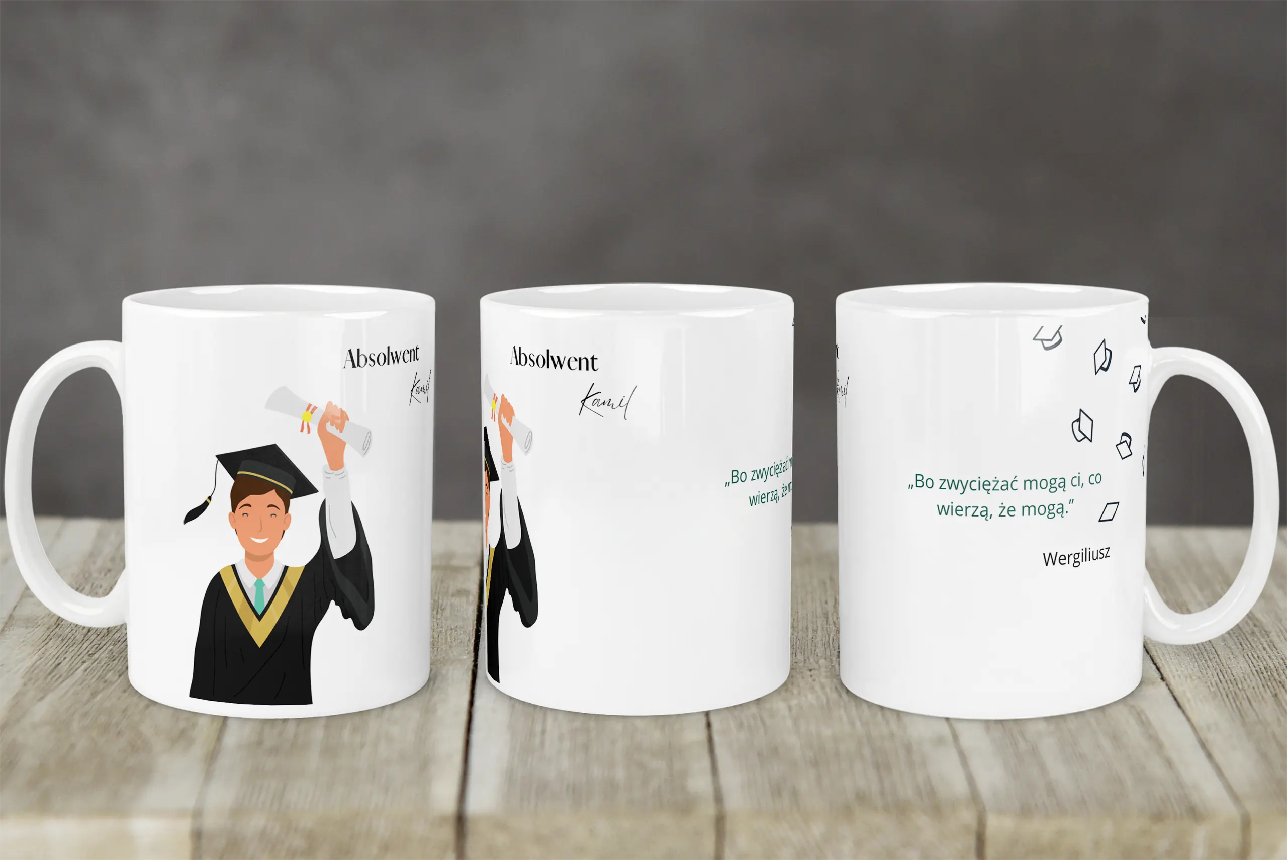 Personalizowany kubek dla absolwenta to idealny sposób na uczczenie ukończenia szkoły lub studiów. Zawiera elegancką ilustrację postaci w todze akademickiej, imię obdarowanego oraz inspirujący cytat Wergiliusza: „Bo zwyciężać mogą ci, co wierzą, że mogą.”